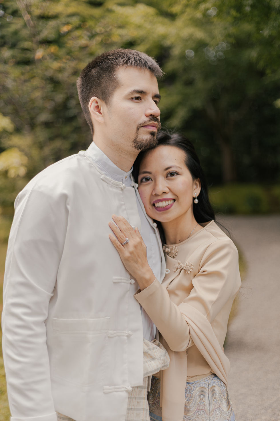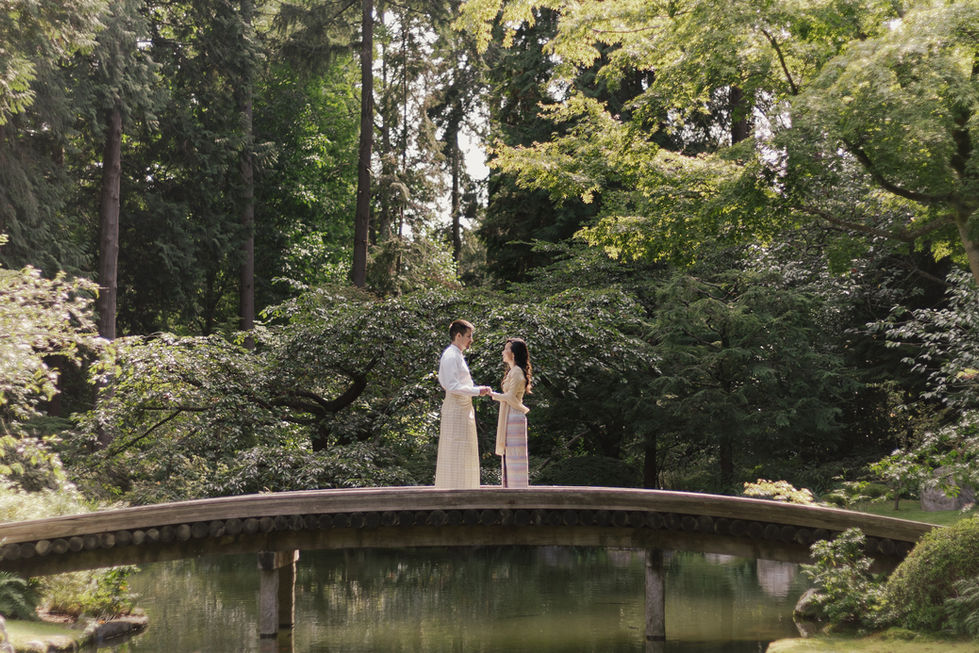 This engagement session at Vancouver's UBC Garden beautifully intertwines heritage and modern love. Featuring the couple in elegant traditional Burmese attire, the photos celebrate their unique intercultural story against a lush, natural backdrop.